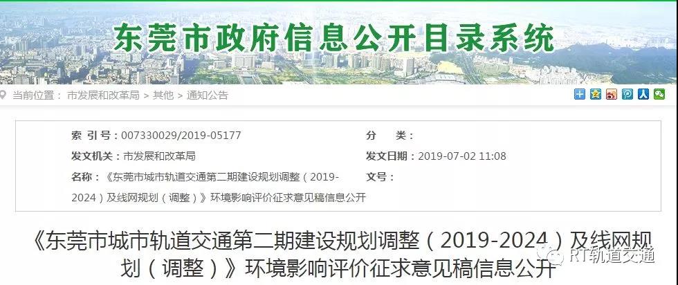 2019年7月2日,東莞地鐵官網(wǎng)發(fā)布了《東莞市城市軌道交通第二期建設(shè)規(guī)劃調(diào)整(2019-2024)及線網(wǎng)規(guī)劃(調(diào)整)》環(huán)境影響評價征求意見稿信息公開: