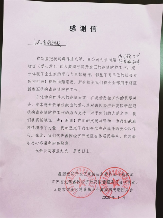 我們企業(yè)沒能奮戰(zhàn)在一線,在家里也是心系疫情。江蘇亞冠軌道交通科技有限公司董事長陳建榮先生作為濱湖區(qū)政協(xié)委員、民建會員,不忘社會責(zé)任,積極想辦法通過各種渠道籌集救援物資,響應(yīng)國家居家隔離的號召外盡可能地為國家為災(zāi)區(qū)為當(dāng)?shù)匾咔榉揽乇M一份綿薄之力。